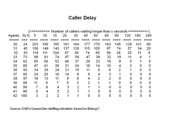 As you can see, 30 agents will provide a service level of 24 percent in 20 seconds. With 31 agents, things improve dramatically. Service level jumps to 45 percent, a huge improvement. Adding one more person yields another big improvement. In fact, adding only four or five people takes service level from the depths of poor service to something a lot more acceptable to callers.