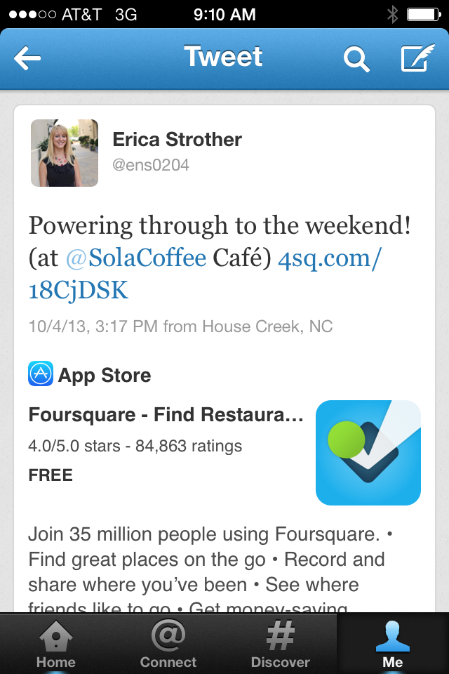One day, as I was sipping coffee and working on a newsletter, the owner of Sola came over to my table. I had never met him before, but he greeted me by name. He had seen my previous check-ins and tweets and said he was hoping to meet me in person and thank me for my business. We chatted for a few moments, and now each time I visit the coffee shop, he makes a point of saying hi if he’s working.