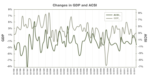 What causes all the ups and downs? One explanation is the ACSI tends to be a leading indicator of changes in the US gross domestic product: