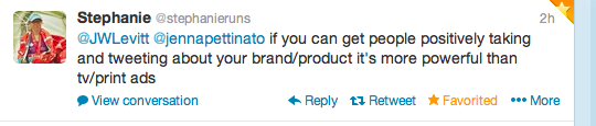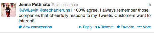 Like Jana and Jenna have shared, their positive experiences with a brand have solidified their loyalty to the specific brand. This is a new opportunity, as previously this would only be possible by picking up the phone to give a company feedback. Social Media provides for a much more casual forum for a similar opportunity.